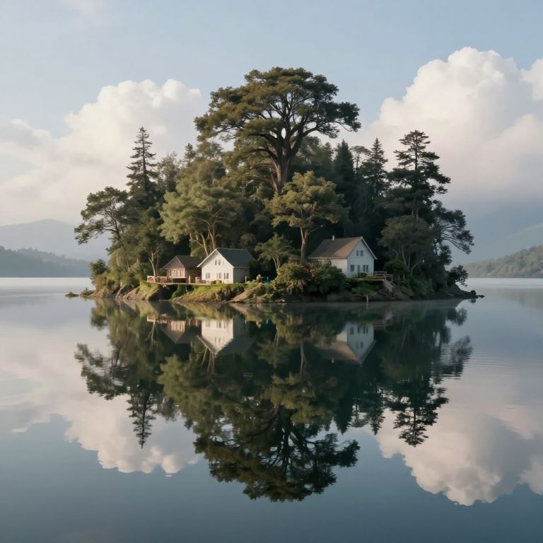 Photograph of a serene, small island in a calm lake, featuring two white cottages with brown roofs nestled among tall, dense pine trees. The island's reflection is perfectly mirrored in the still water, creating a symmetrical image. The sky above is clear with soft, fluffy clouds, and the distant shoreline is faintly visible on the left. The natural colors are predominantly greens, whites, and blues, evoking a peaceful, tranquil atmosphere. The image captures the island's solitude and the reflective beauty of the water.