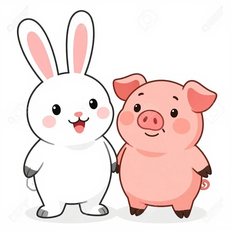 Cute digital drawing of a white bunny and pink pig standing side by side, both smiling with blushes on their cheeks.
