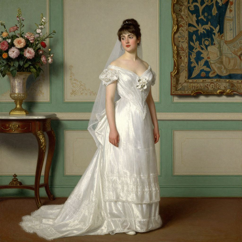 A vintage oil painting by Frederick William Elwell from 1911 captures a woman in a classic white wedding dress with off-the-shoulder sleeves, set against a refined interior backdrop featuring ornate green paneling, a floral arrangement, and a framed tapestry, evoking a timeless and elegant artistic style.