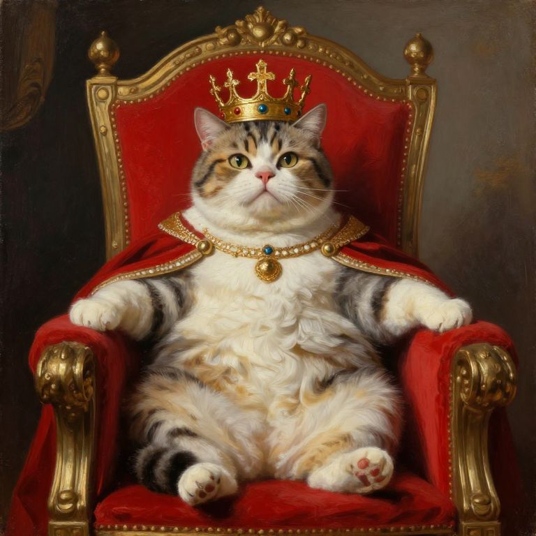 A regal, fat cat with a crown sits on a red throne, depicted in an oil painting.