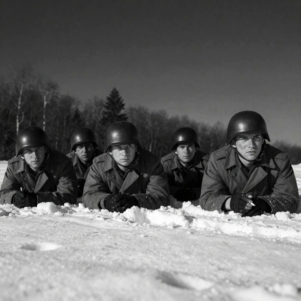 Black and white photograph of four male soldiers in winter gear and helmets, lying in snow. Three on left and one on right, all looking ahead. Trees in background, dark sky. Soldier on right holds cigarette. Snowy foreground. Intense expressions.