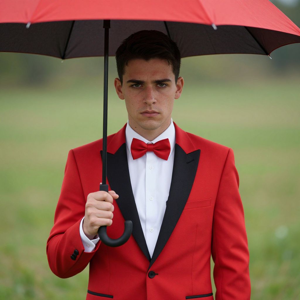 Photograph of a serious-looking young man with short dark hair, standing in a grassy field. He's wearing a vibrant red tuxedo with a black lapel, a white dress shirt, and a red bow tie. He holds a red and black umbrella above his head, which matches his outfit. The background is blurred green grass, making him the focal point. The overall vibe is formal yet dramatic.