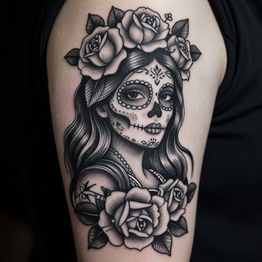 The image depicts a highly detailed and intricate tattoo design inspired by the Day of the Dead celebration. The central figure is a woman with long, flowing hair adorned with roses and leaves, creating a striking contrast against the black and white color scheme. Her face is painted with a sugar skull design, featuring delicate patterns and a skull-like structure, symbolizing the Mexican tradition of honoring the deceased. The tattoo is embellished with various floral elements, including roses and leaves, which add a touch of elegance and natural beauty to the design. The overall composition is balanced, with the tattoo occupying the majority of the space, while the background remains minimalistic, allowing the intricate details of the tattoo to stand out. The interplay of light and shadow enhances the depth and texture of the design, making it appear three-dimensional and lifelike.
