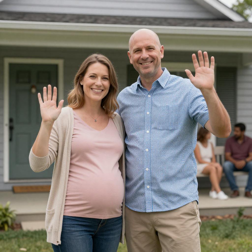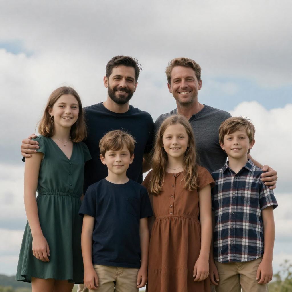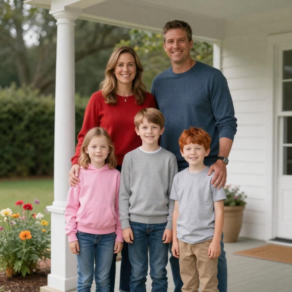 Photograph of a family outside a white porch. Five people: two adults, three children. Adults smiling, children standing in front. Female adult in red sweater, male adult in blue shirt, girl in pink hoodie, boy in gray sweater, red-haired boy in gray shirt. White porch, greenery, flowers in background. Casual clothing, relaxed poses, smiling expressions.