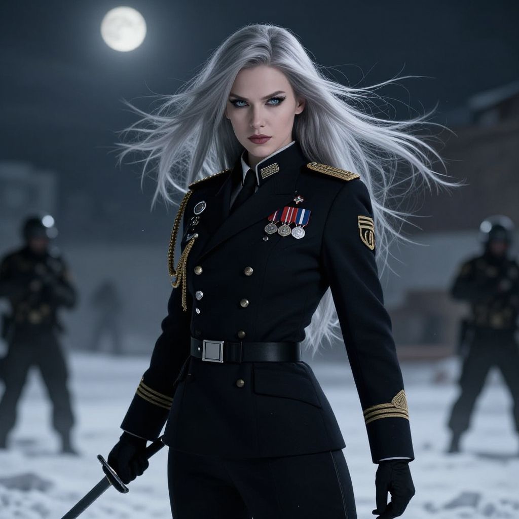 A digital artwork depicts a fierce, silver-haired woman in a black military uniform adorned with medals and gold trim, standing in a snowy, moonlit landscape. Her long hair flows dramatically in the wind. She holds a sword in her right hand and wears black gloves. Her intense blue eyes and red lipstick contrast with her pale skin. In the background, two blurred, shadowy figures in similar uniforms stand in the snow. The scene is illuminated by a bright moon, creating a stark, dramatic atmosphere. The woman's confident, commanding presence is the focal point of the image.