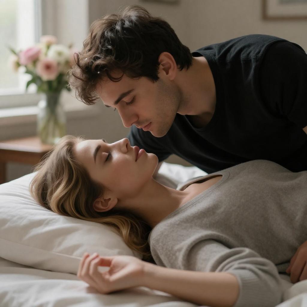 Close-up photograph of a romantic scene. Blonde woman with closed eyes, gold earrings, and soft makeup in a man's embrace. Man's chin resting on her forehead, wearing a white shirt and black suit. Gentle, intimate interaction.