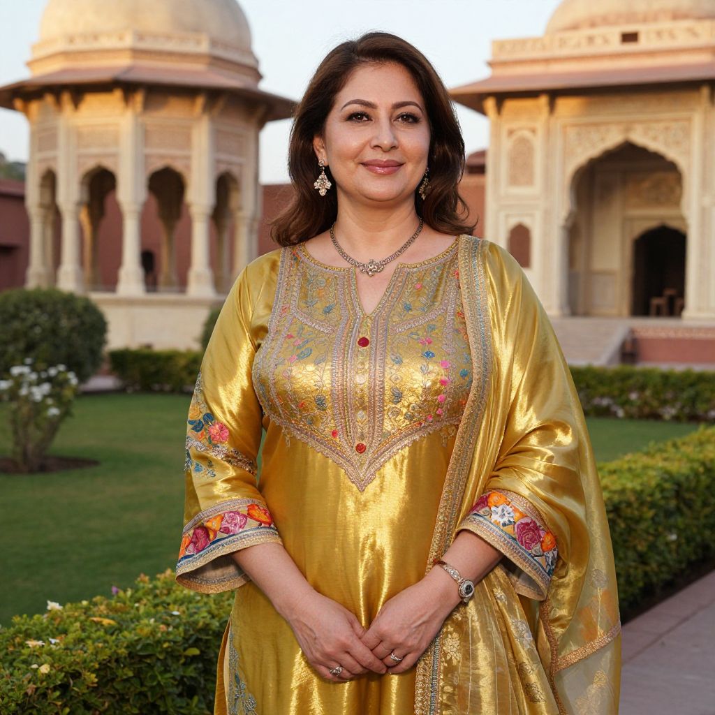 A middle-aged woman with gentle features, a fair complexion, and a kind smile wears a vibrant elegant salwar suit with floral patterns and layered cuffs. She is standing near a garden in Jaipur, with havelis and intricate stone carvings in the background, the setting sun reflecting off the golden silk of her outfit.. The woman has big breasts and cute face