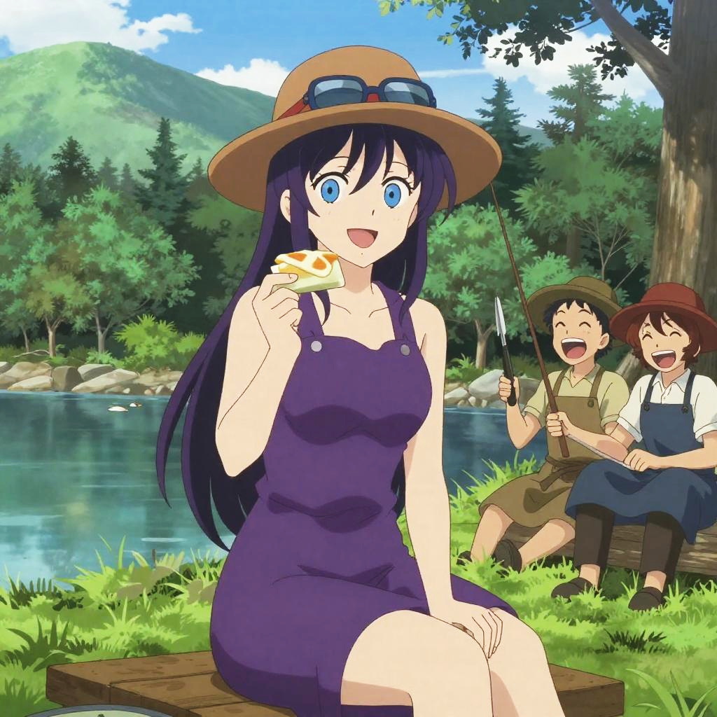 Cowboy shot, adachi rei, sitting, outdoors, nature, purple hair, blue eyes, smiling, holding food, purple dress, sun hat, sunglasses, mountain, tree, forest, day, picnicking, on a solo adventure, cheerful laugh, wearing a bandana