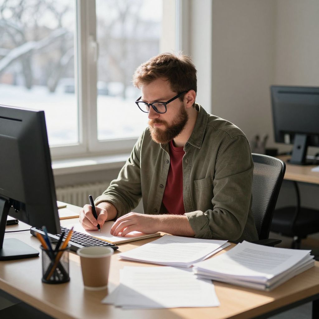 In a sunlit office, a man with a beard and glasses, dressed in a green shirt over a red shirt, is engrossed in his work at a desk. The desk is cluttered with various items, including a computer monitor, a cup, a pencil holder with pens, and scattered papers. The man's hand is poised over a notepad, and he holds a pen, suggesting he is either writing or about to write. The background features a window with a view of a snowy landscape, adding a serene touch to the scene. The overall composition is well-balanced, with the man centrally positioned and the objects around him arranged in a way that creates a sense of depth and focus. The interplay of light and shadow, along with the warm tones of the man's clothing and the cool hues of the snowy background, contributes to a harmonious and visually appealing image.