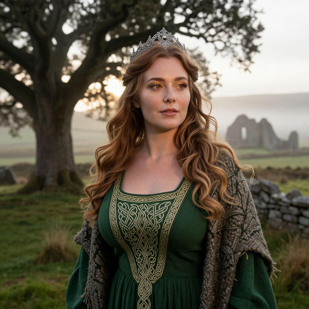 A realistic photographic portrait of a woman dressed as an Irish Celtic maiden, wearing a flowing green dress with intricate Celtic knot patterns, golden embroidery, and a woven shawl, standing in a misty Irish countryside at sunrise with ancient oak trees and a backdrop of rolling hills and stone ruins, her face has soft, ethereal features with flowing golden-brown hair and warm brown eyes, eyes glistening with magical light, wearing a small silver crown on her head, mystical and serene atmosphere. The woman has big tits and cute face