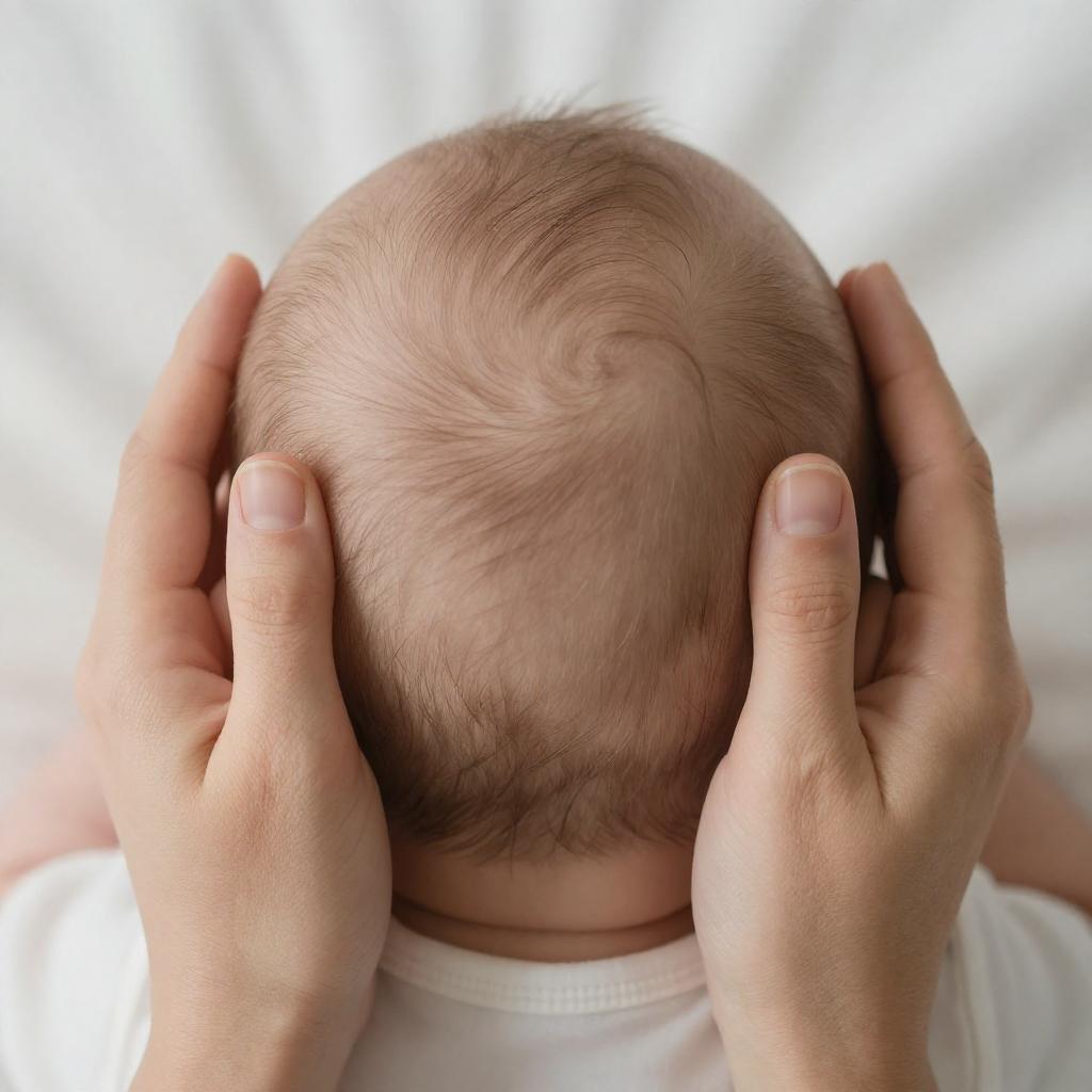 Close-up image of light-skinned adult hands gently holding the back of a newborn baby's head. The baby has fine, light brown hair with a visible swirl pattern on the scalp. The background is soft white, creating a calm and intimate atmosphere with soft, even lighting.