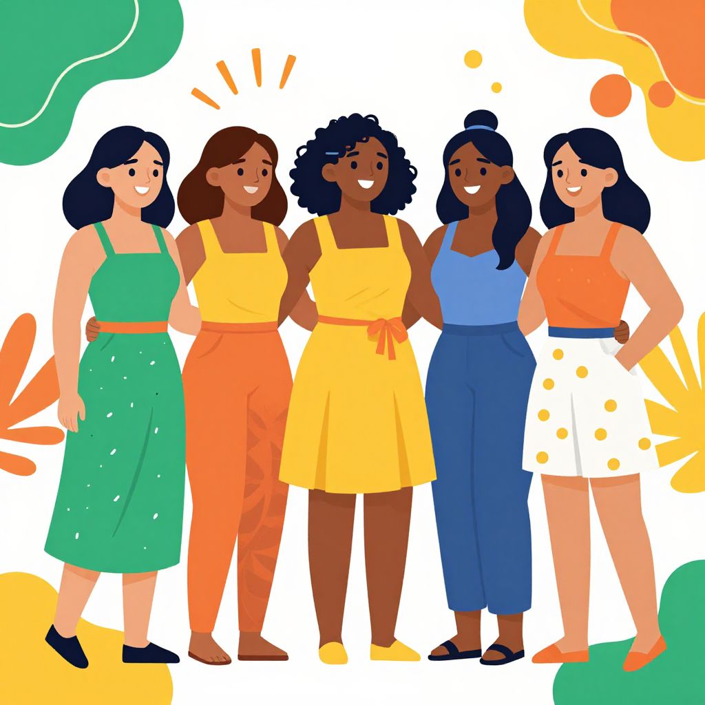 Illustration of five smiling, diverse women in colorful dresses and pants, standing together against a white background with abstract green, yellow, and orange shapes.
