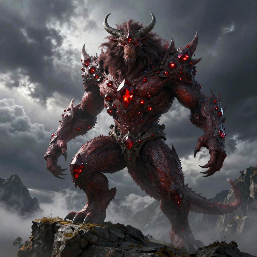 Carbuncle creature, fierce and majestic fantasy beast with radiant red gems, shimmering coat, powerful stance atop a mountain cliff, dramatic stormy sky