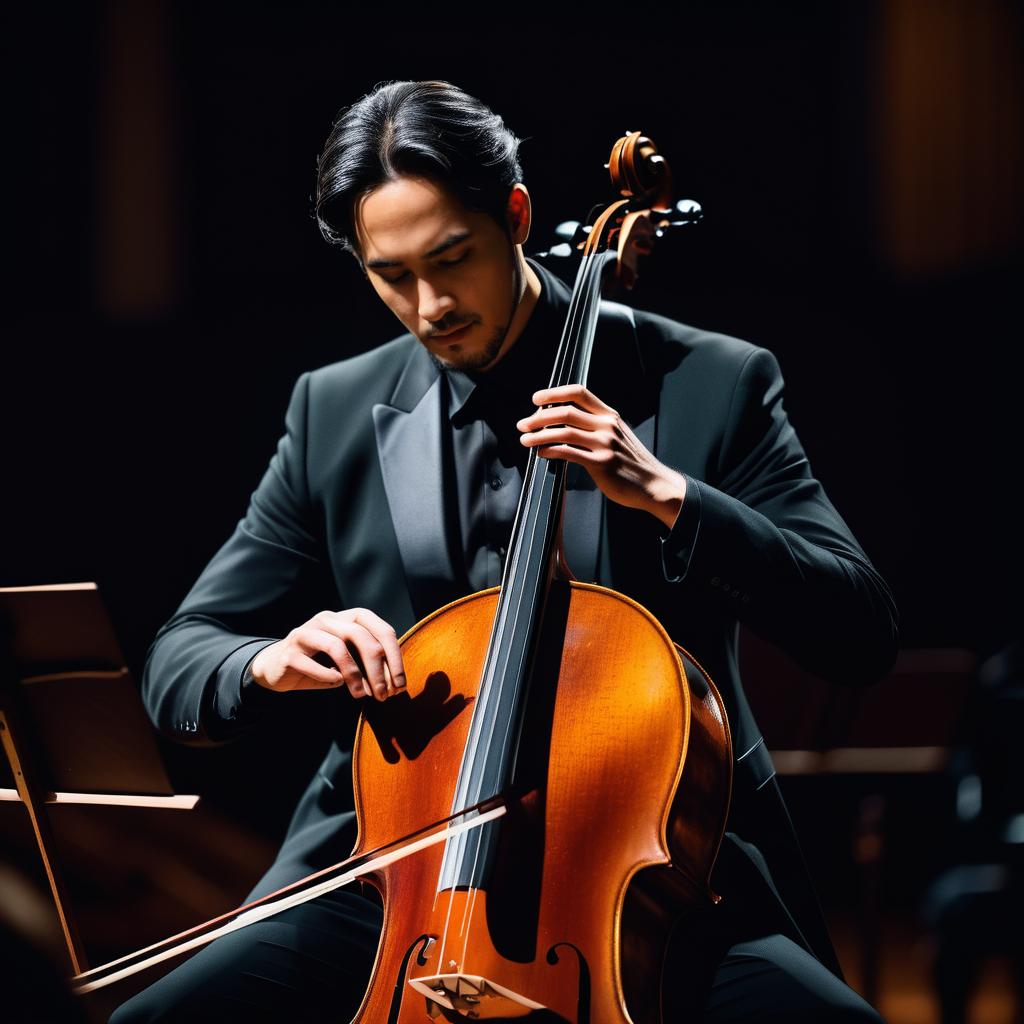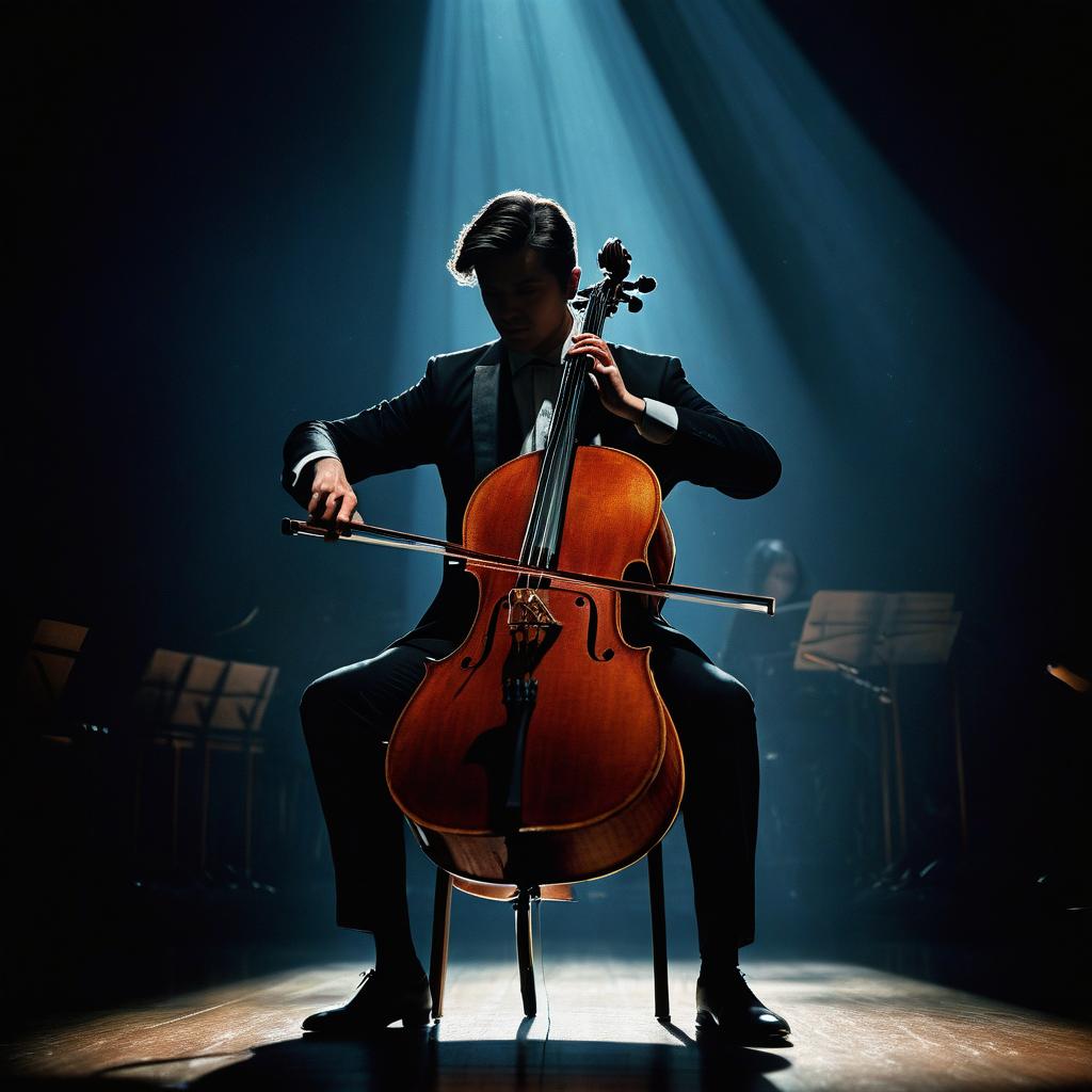 Introspective portrait of a young male cellist dressed in a formal black suit, seated and playing cello under a soft spotlight in a quiet, elegant concert hall. The scene features chiaroscuro lighting with vivid highlights on the cello and deep shadows surrounding the subject, creating a cinematic and moody atmosphere.