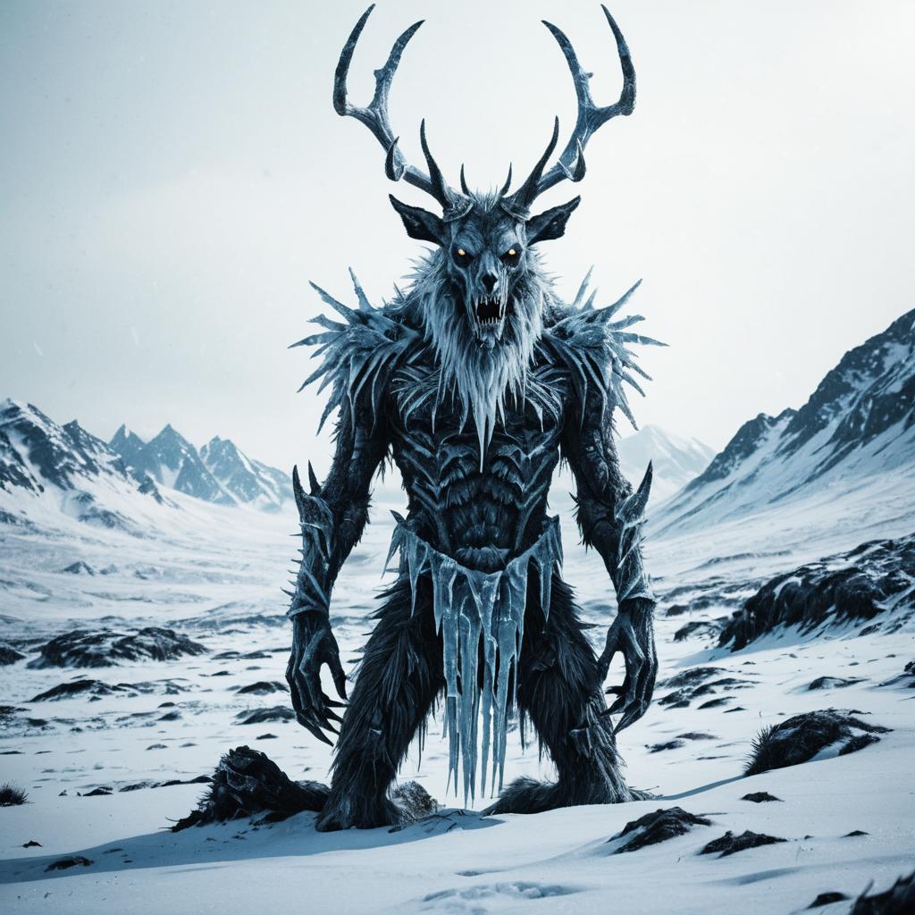 Fantasy wendigo made of frosted ice, with jagged frozen spines. Set in a bleak snowy tundra, within a mysterious setting. Highly detailed digital painting with cool sharp gleam.
