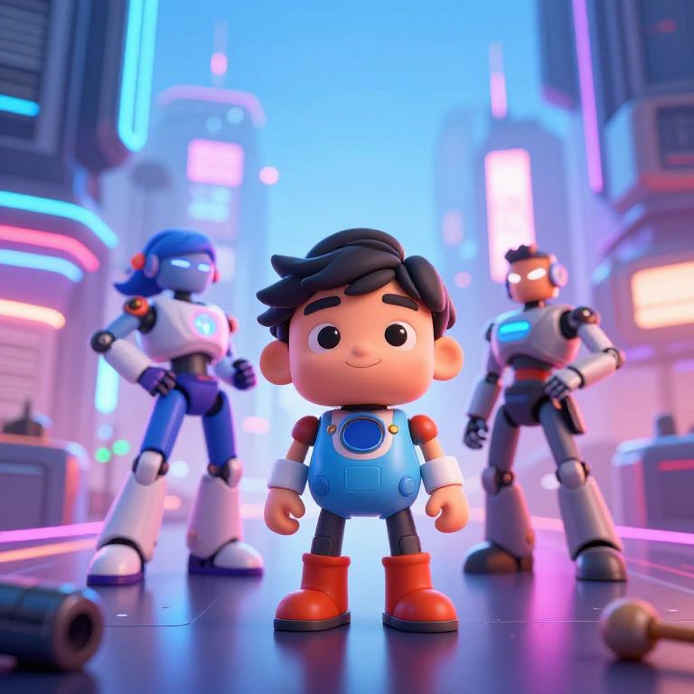 CGI image of a cute, cartoon-style boy in blue overalls and red boots, surrounded by three robotic figures in a neon-lit futuristic city