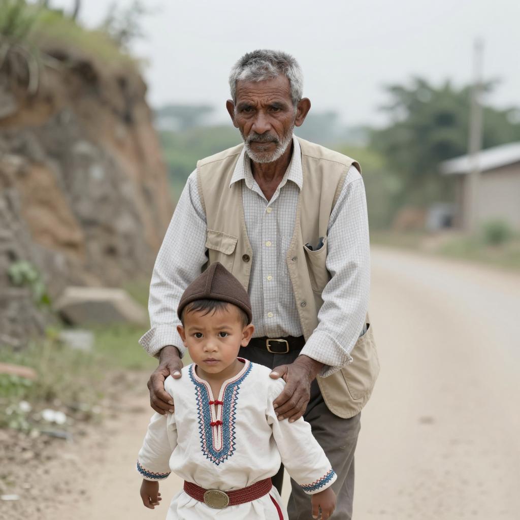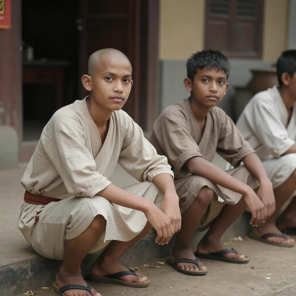 Multiple boys, 2boys, male focus, bald, robe, sitting, realistic, sandals, black hair, traditional media, squatting, looking at viewer