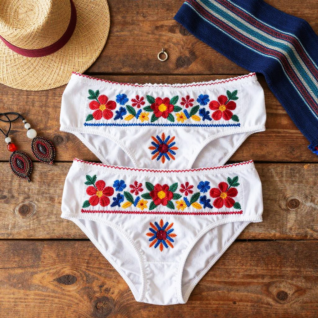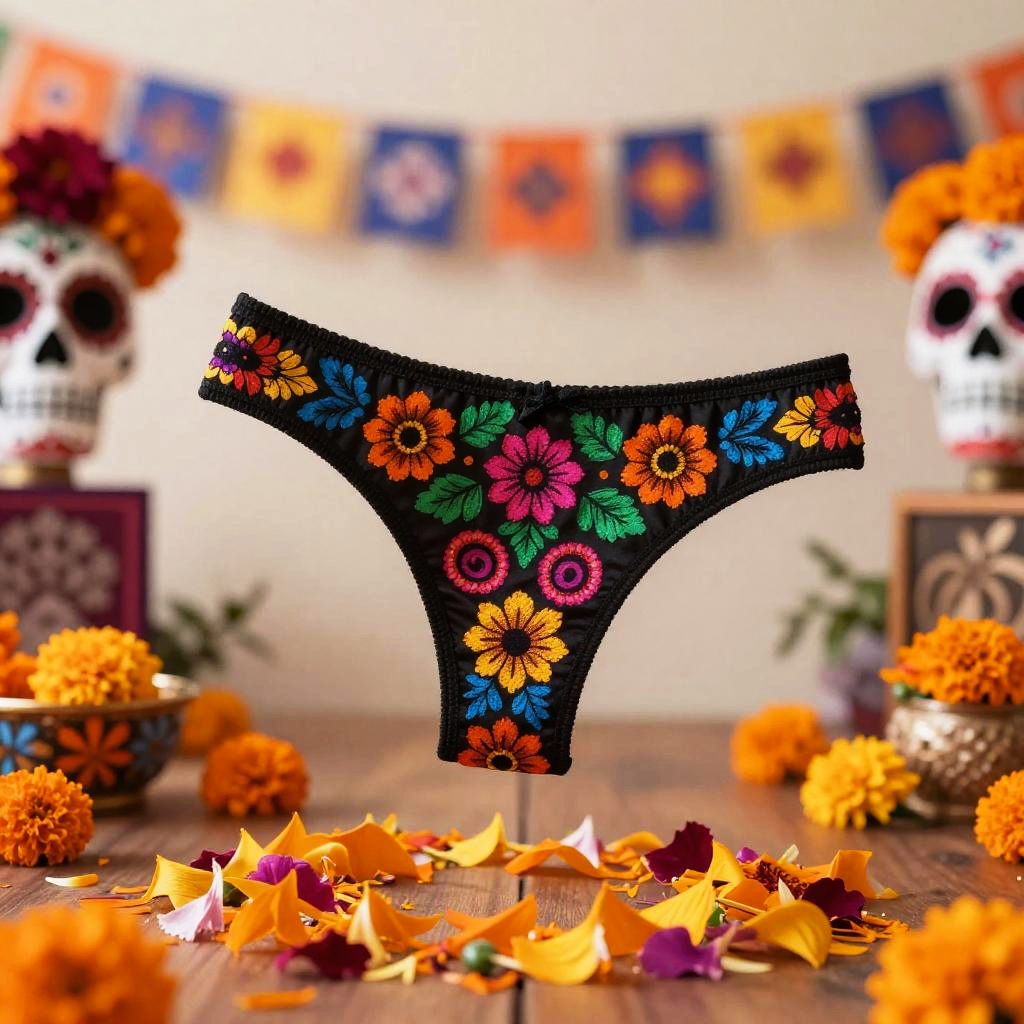 Mexican panties floating in mid-air with swirling vibrant patterns, surrounded by marigold petals, soft-focus background capturing a festive Day of the Dead atmosphere.