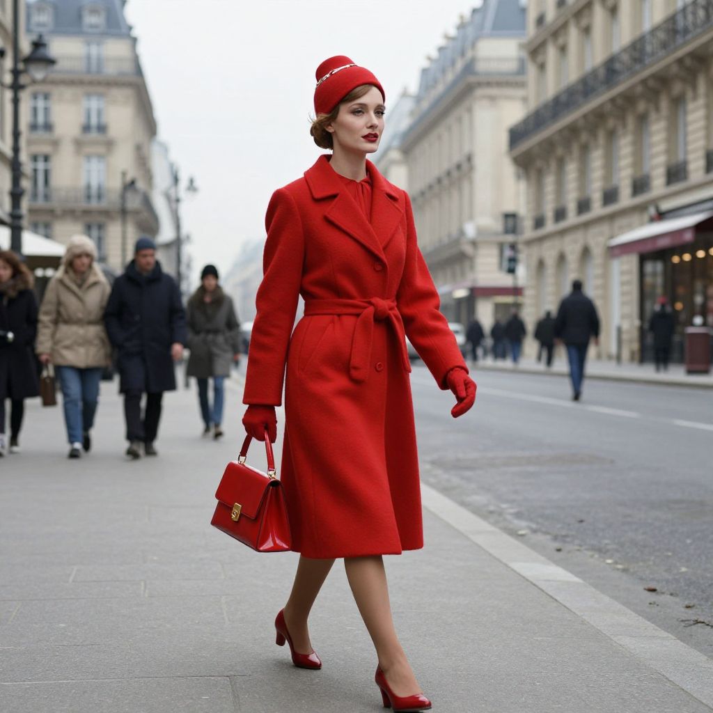 Photograph of a stylish woman in a vibrant red coat, matching hat, gloves, and shoes, walking confidently on a Parisian street.