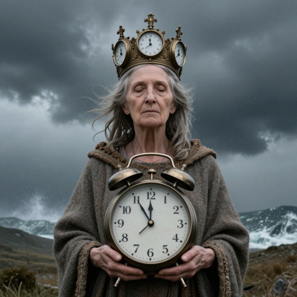 Enthroned amidst a tempestuous landscape, an elderly woman adorned with a crown of ticking clocks exudes a haunting serenity, embodying the weight of time's relentless march and the quiet resilience of enduring souls.