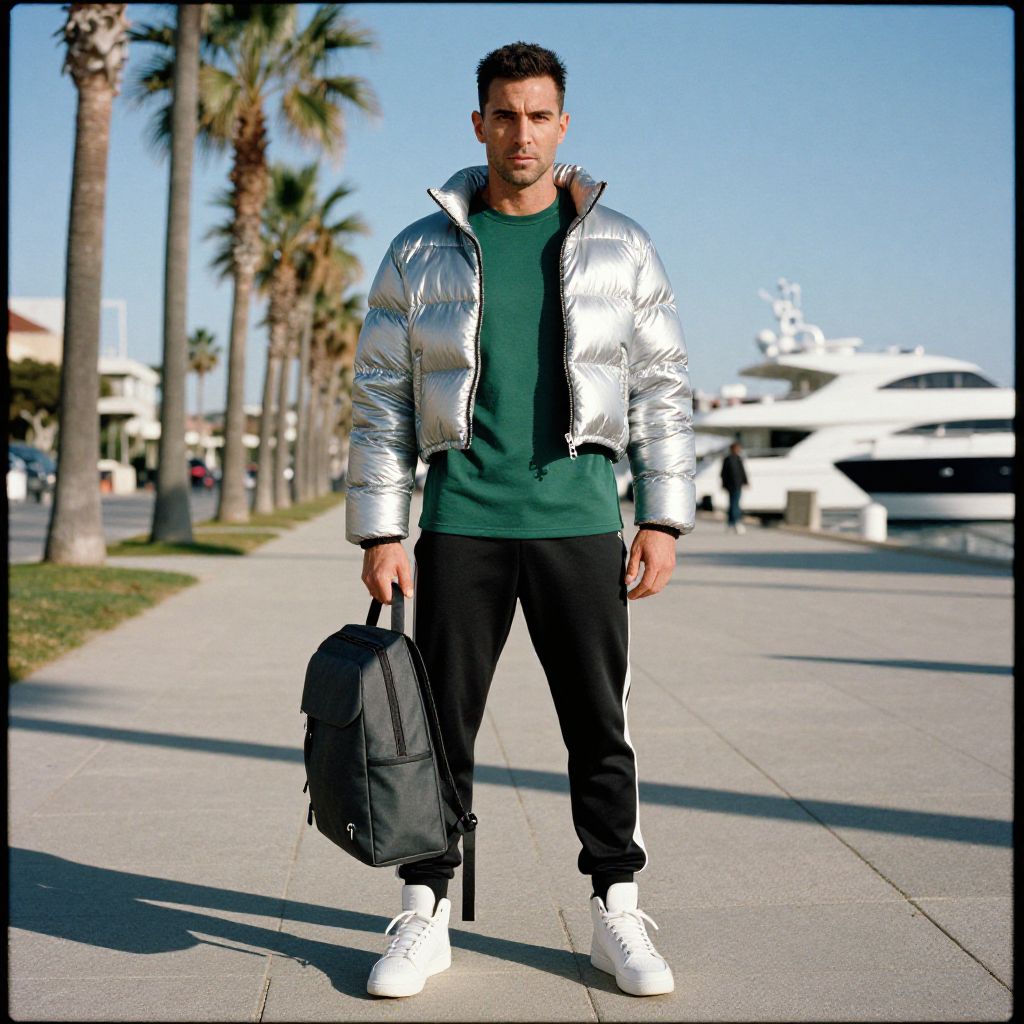A man, fitted track pants in black, long-sleeve athletic shirt in forest green, cropped puffer jacket in metallic silver, high-top sneakers in white, sleek gym backpack in charcoal, sunlit promenade, palm trees swaying, luxury yachts docked, 3M ferrania analog film stock, confident expression. Man has masculine face and piercing eyes