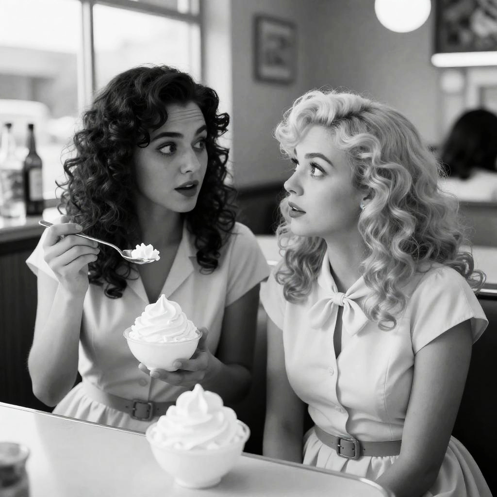 Black and white photograph of two women in a diner. Woman on left with dark, curly hair, wearing a light dress, holds a spoon in her right hand and a bowl with whipped cream in her left. Woman on right with light, curly hair, wearing a light dress with a bow, looks up at the other woman. Both women have surprised expressions. Background includes a counter with bottles and a window. Counter surface is glossy.