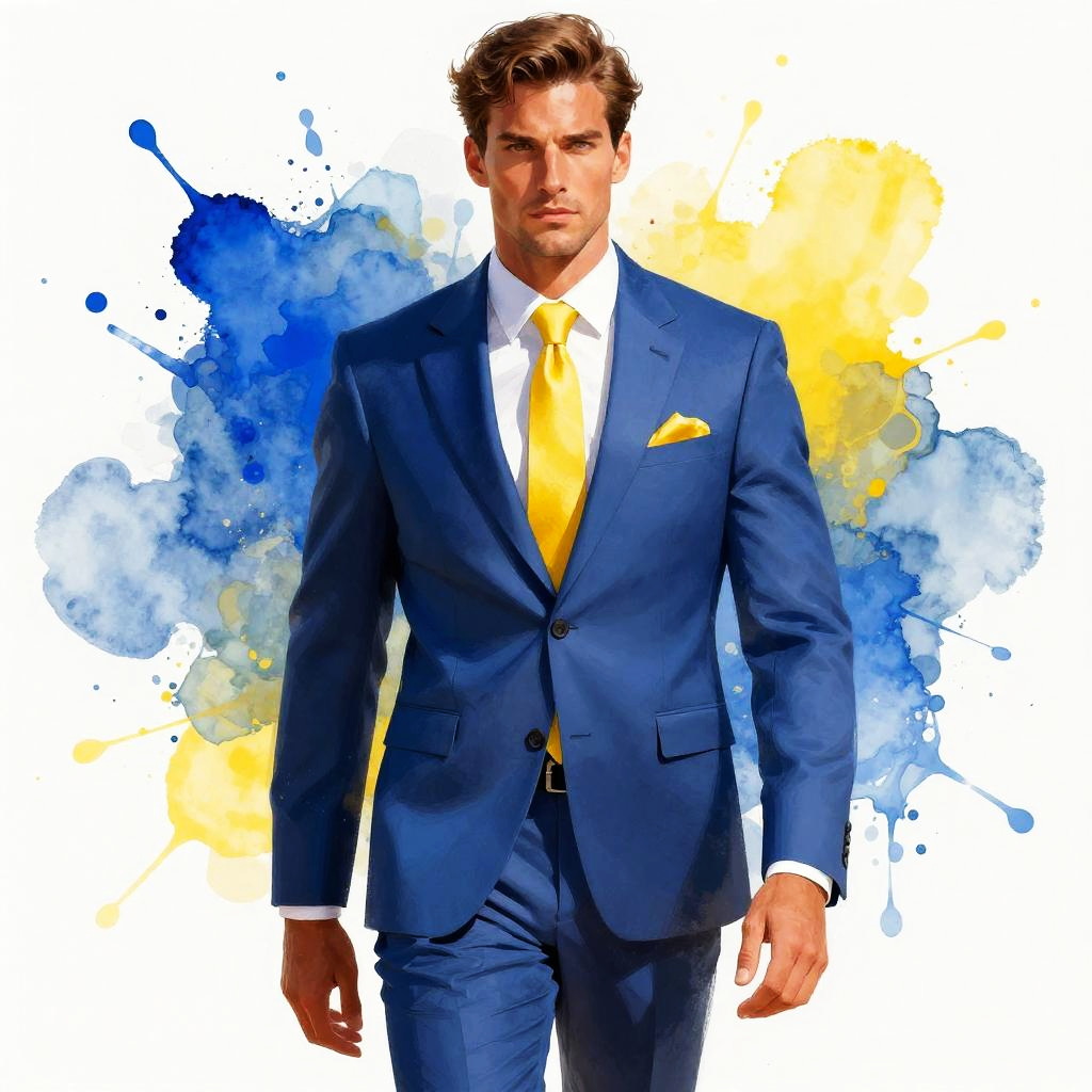 A vibrant digital illustration of a handsome man in a sharp, blue suit with a bright yellow tie and matching pocket square. He has short, wavy brown hair and a serious expression. The background is an abstract splash of blue and yellow watercolor, adding a dynamic, artistic touch to the image. The suit fits well, emphasizing his tall, lean physique.