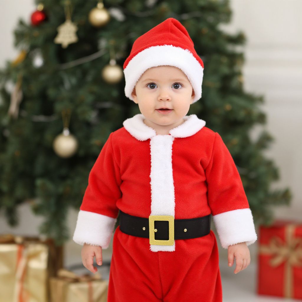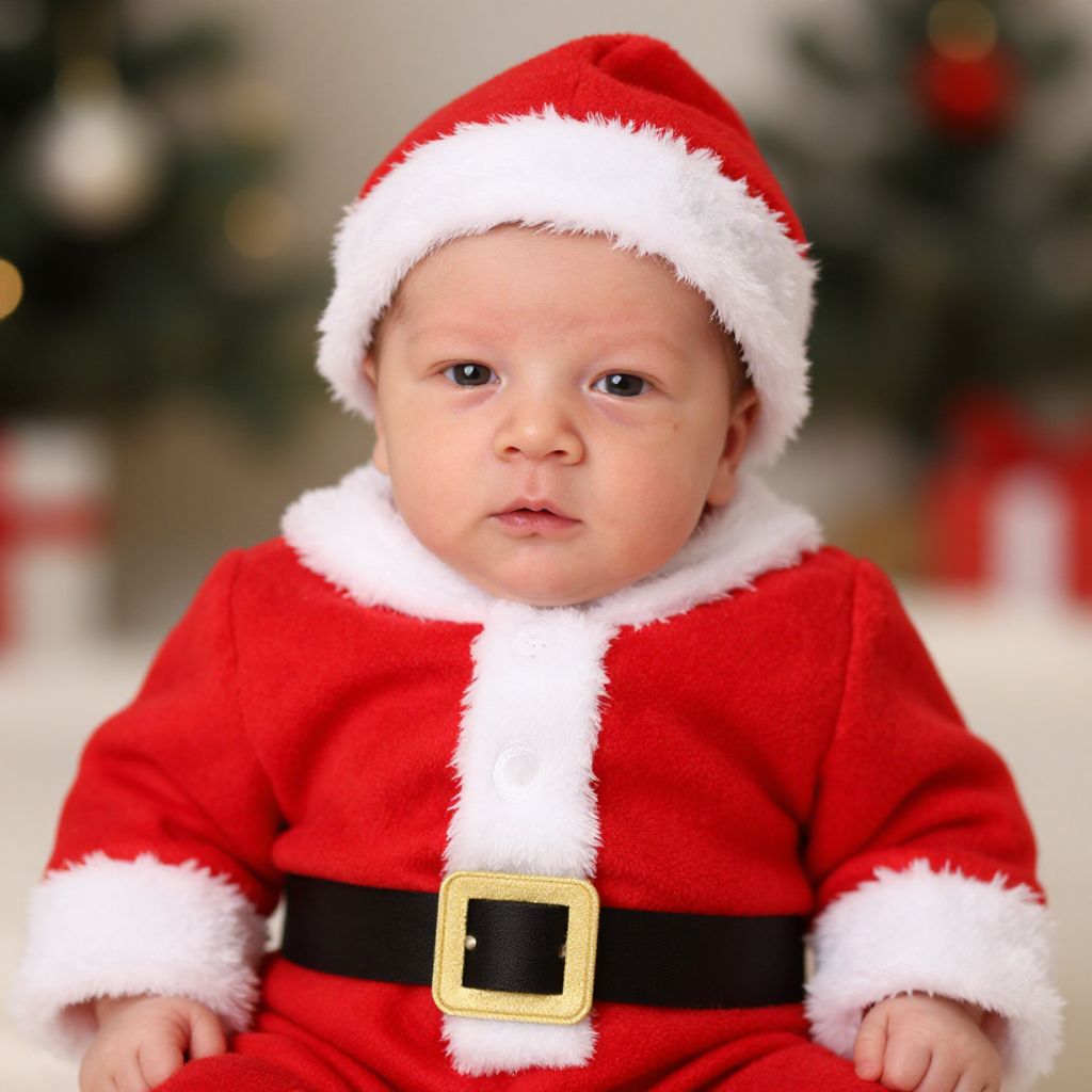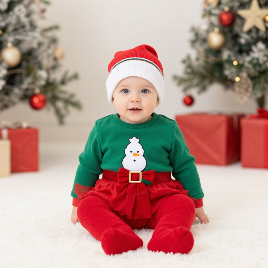 Photograph of a baby with blue eyes, wearing a Santa hat, green shirt with snowman, red pants, and belt, sitting on white carpet