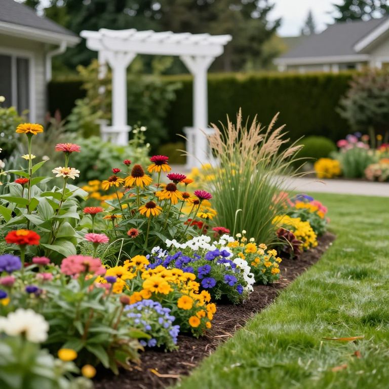 Vibrant rows of mixed annuals and perennials, featuring zinnias, coneflowers, and sedge grasses, burst with colorful blooms along the edge of a meticulously manicured residential backyard lawn near Seattle, with a softly focused white arbor standing gracefully in the background.