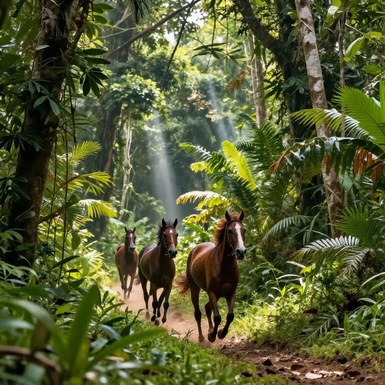 Galopando horses racing through a lush jungle trail, dense tropical foliage on either side, shafts of sunlight filtering through the canopy, vibrant greens and earthy tones, sense of speed and wild freedom, highly detailed and immersive environment.