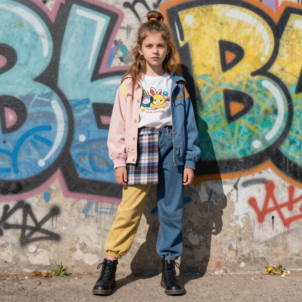 A young man wearing oversized denim jackets curated by Lotta Volkova, positioned in an urban rooftop with sunset glow, embodying subversive high-fashion aesthetics.