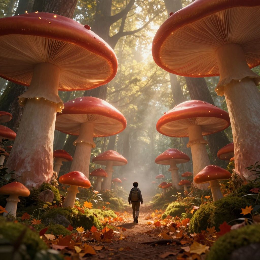 A fantasy landscape featuring an enchanted forest filled with massive, oversized red mushrooms with realistic textures and glowing edges, The forest floor is covered in vibrant autumn foliage and soft moss, Sunlight filters through a gentle mist, casting warm golden beams across the scene, A lone adventurer, a small human figure with a backpack, walks down a narrow forest path, emphasizing the scale of the gigantic mushrooms, The atmosphere is whimsical, magical, and dreamlike, with a surreal balance of realism and fantasy elements, Soft focus in the background enhances the depth and otherworldly feel