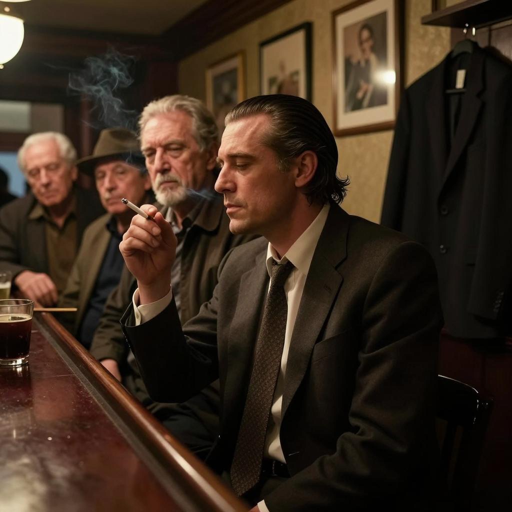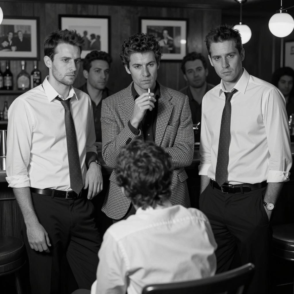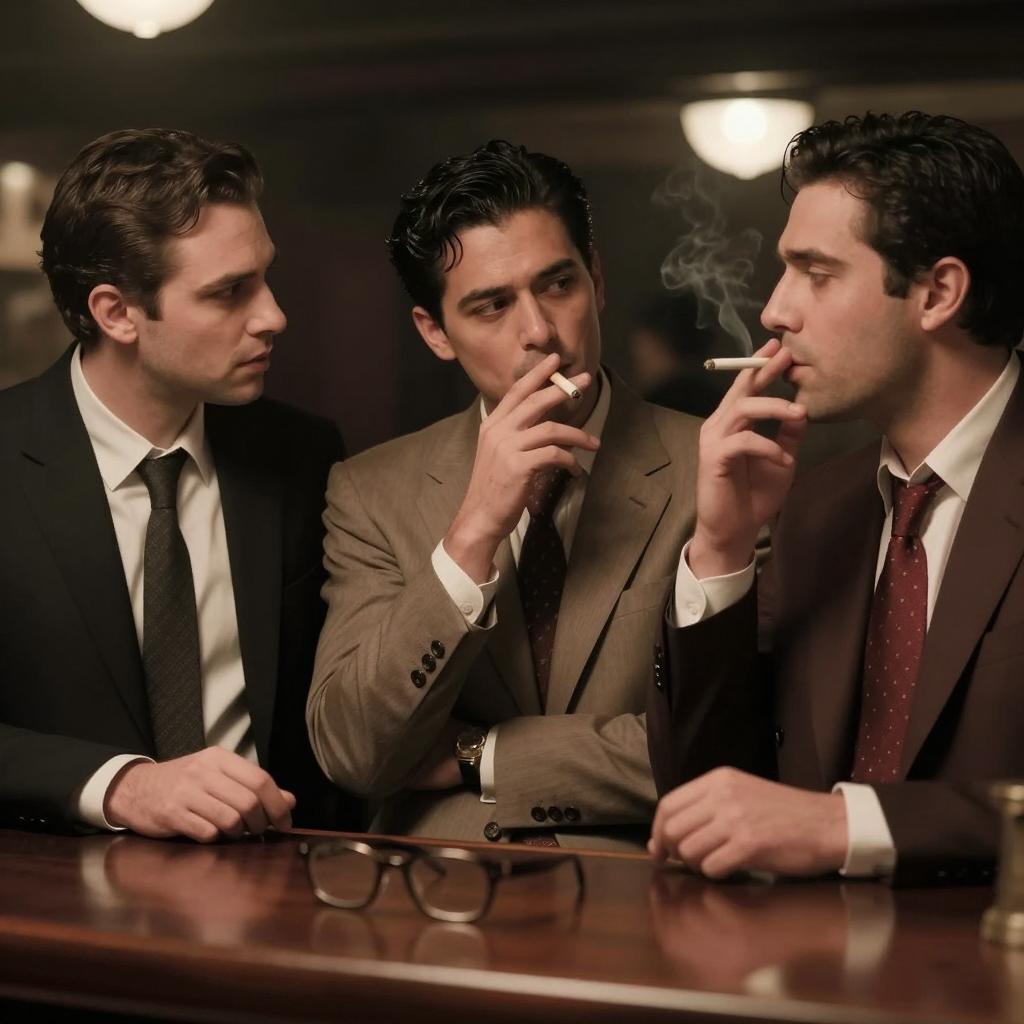 Three men in a dimly lit bar. The central man with dark hair, tan suit, and cigarette in mouth looks at the man on the left. The man on the left has dark hair, black suit, white shirt, and tie. The man on the right has dark hair, brown suit, red tie, and smokes. Glasses and blurred background are in the foreground.