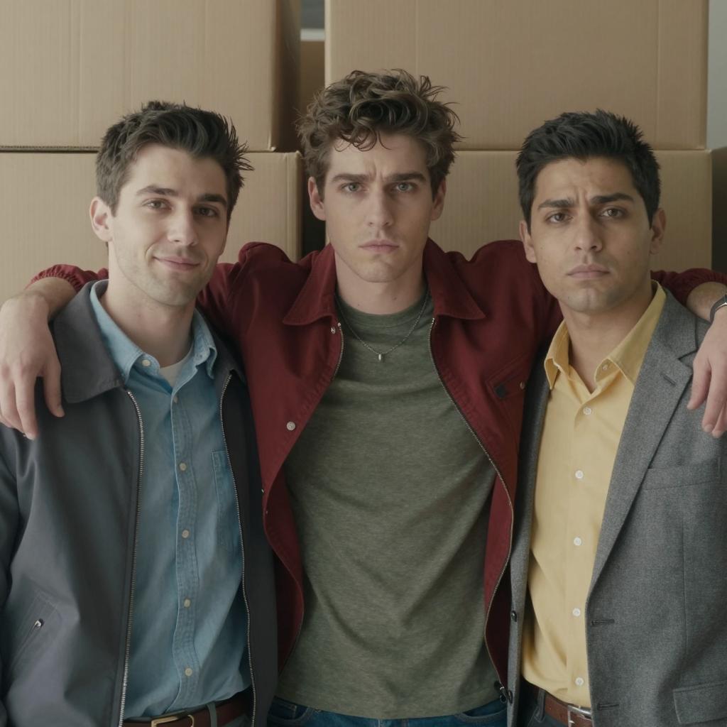Three men in formal suits sitting at a bar with dim lighting. The man in the center has dark hair, a tan suit, and a cigarette in his mouth, looking toward the man on the left. The man on the left has dark hair, black suit, white shirt, and tie. The man on the right has dark hair, brown suit, red tie, and is smoking a cigarette. A pair of glasses rest on the bar counter in the foreground.