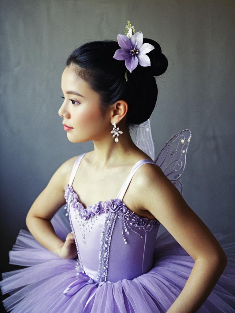 Profile of a young Asian ballerina wearing a lilac tutu adorned with floral and bead embellishments. She has black hair styled in a bun with a lilac flower hair ornament, matching earrings, and translucent fairy wings attached to her back. The costume features delicate detailing and a satin ribbon at the waist.