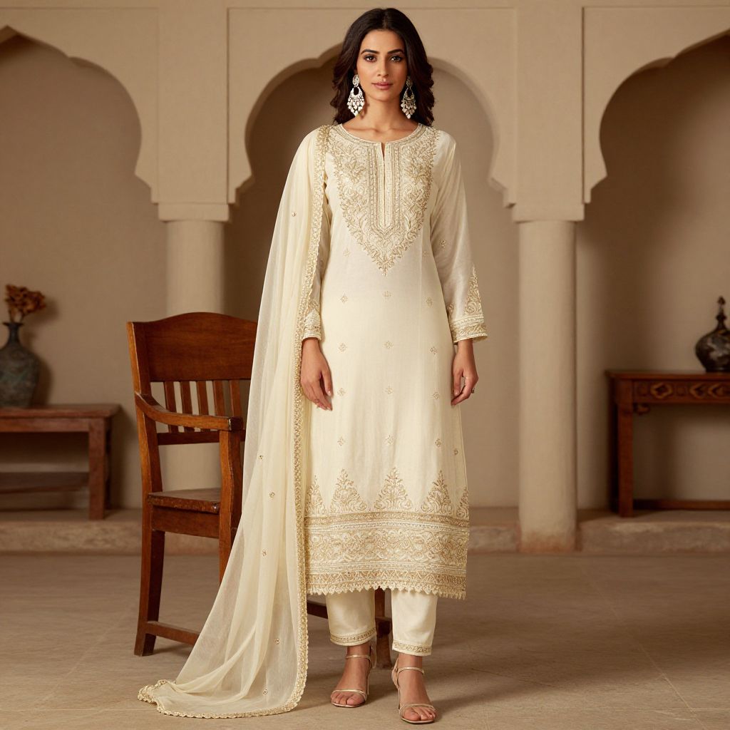 Elegantly styled woman wearing a Pinjra Wala Straight Suit with intricate embroidery and a flowing Sharara, complemented by statement earrings and a sheer dupatta draped over her shoulder, standing indoors with a wooden chair and architectural arches in the background.