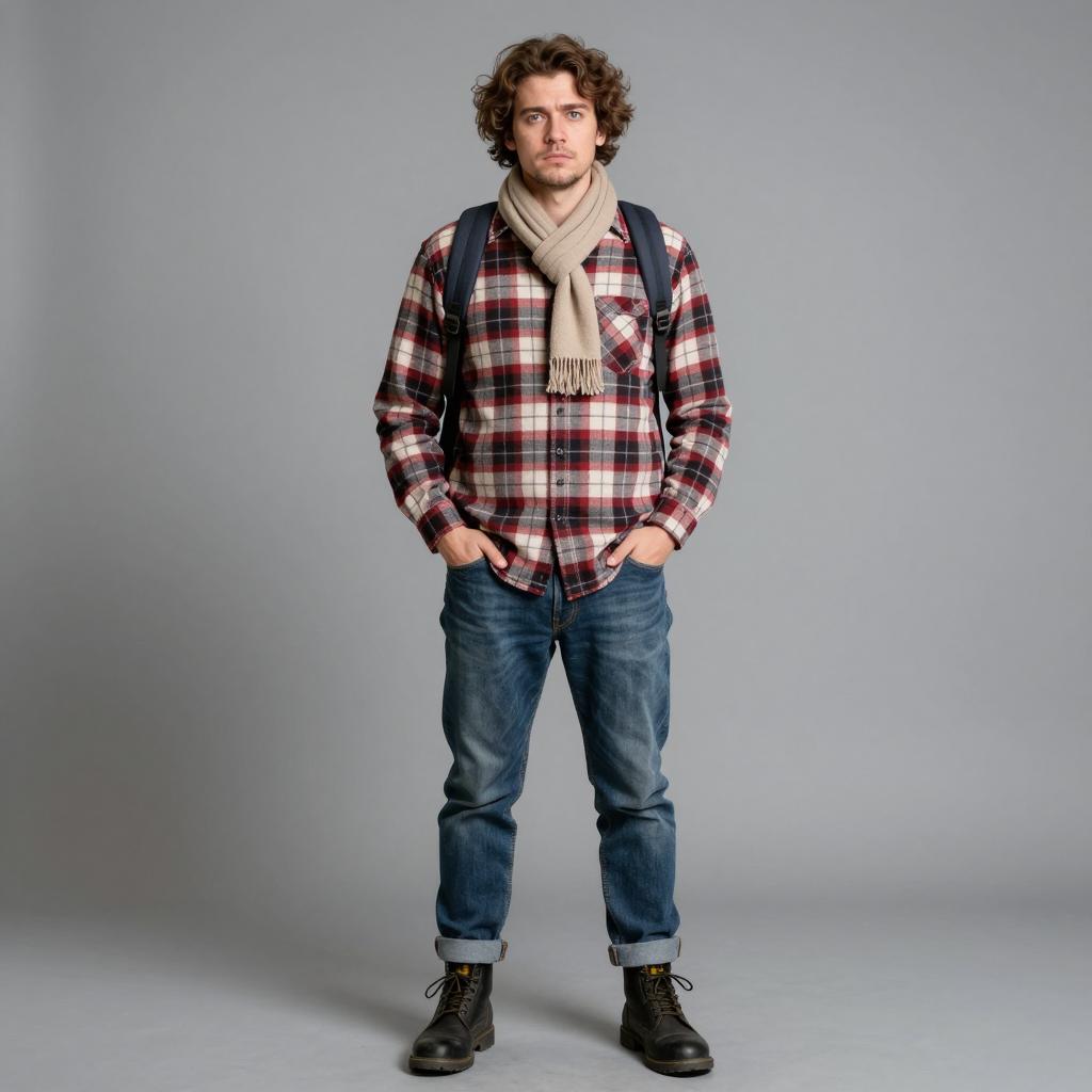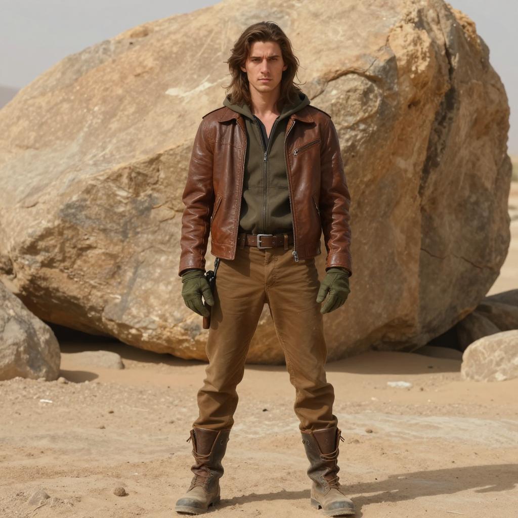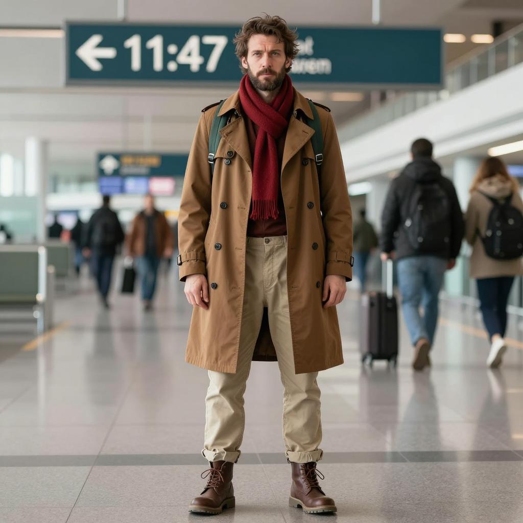 Photorealistic fashion portrait of a male model standing in an urban setting wearing a Mad Max inspired outfit. The man is dressed in a brown long coat, orange scarf, blue shirt, brown pants, black leather gloves, and brown lace-up boots. He has a serious expression with slightly tousled hair, standing on a concrete floor with a blurred city background and other people walking past. Natural daylight highlights the modern casual style from head to toe.