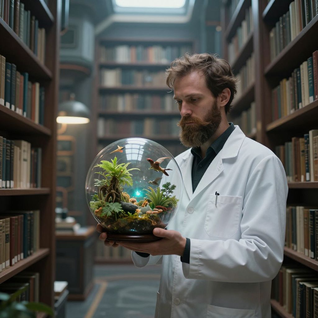 In a surreal, cyberpunk-inspired library filled with towering bookshelves, a bearded man in a lab coat holds a transparent glass orb containing a miniature, self-sustaining ecosystem with lush greenery and flying creatures, embodying the dream-capturing artistry of a futuristic librarian.