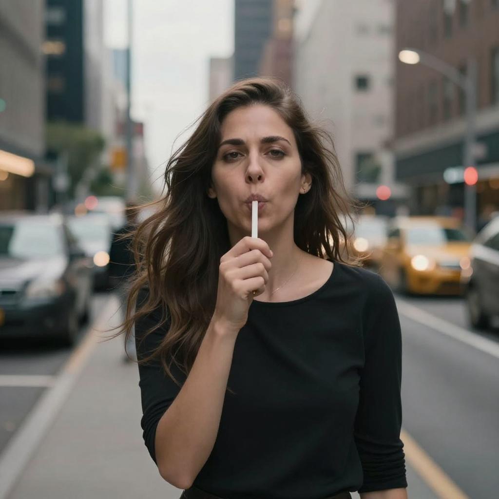 Photograph of a serious-looking woman with long brown hair blowing in the wind, standing in an urban cityscape. She's wearing a simple black top and holding a vertical object in her right hand. The background is blurred, featuring bright city lights, parked cars, and indistinct buildings. The overall color palette is muted with pops of city lights. Her expression is intense, and she's centered in the frame.