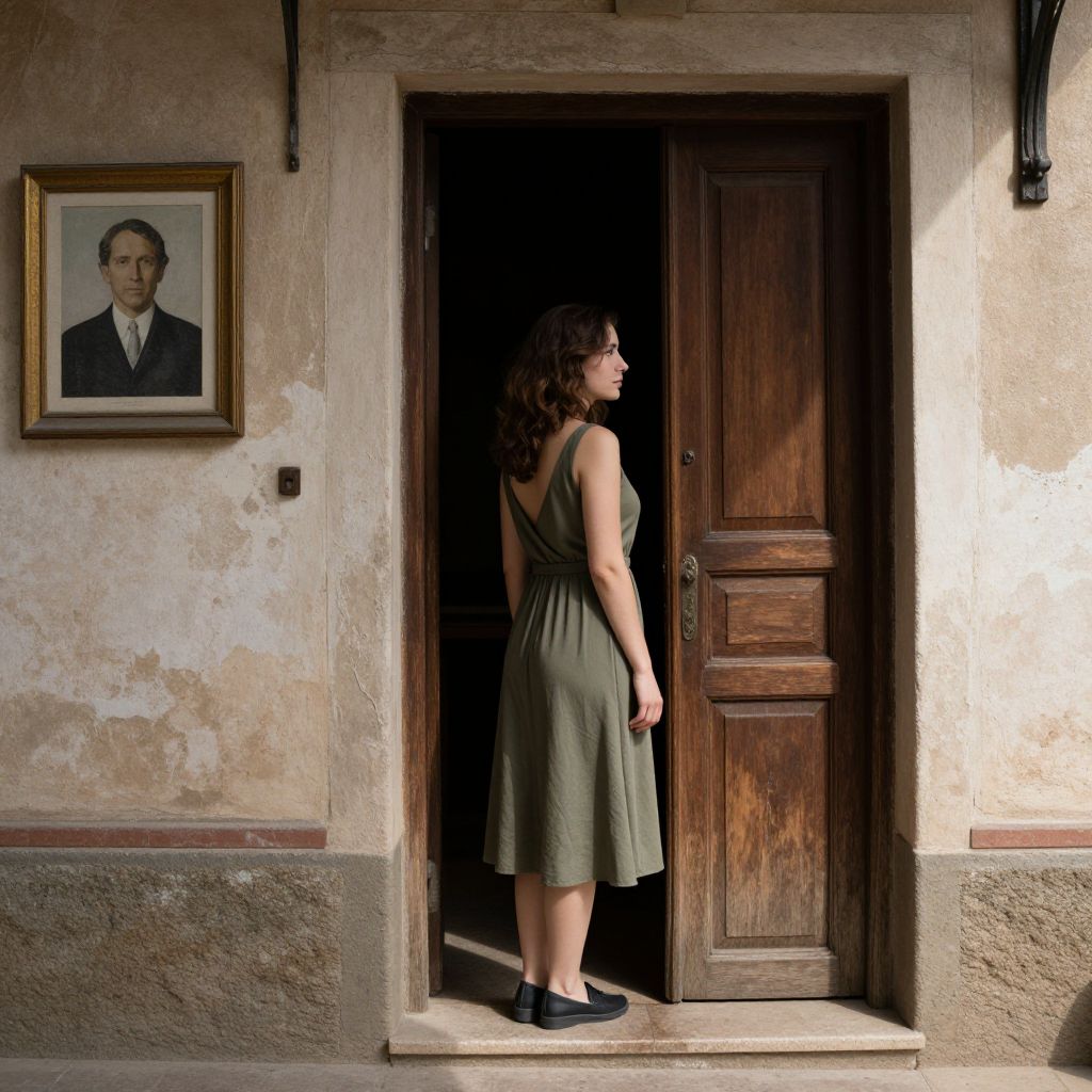 Photograph of a woman with curly brown hair, wearing a sleeveless, olive-green, knee-length dress and black flats, standing in a wooden doorframe. She faces away from the camera, looking to the right. The door is rustic with dark wood and a simple design. The textured, beige wall has a framed portrait of a man in a suit on the left. Sunlight casts shadows, highlighting the wall's worn texture and the door's wood grain. The scene conveys a European, historical ambiance.