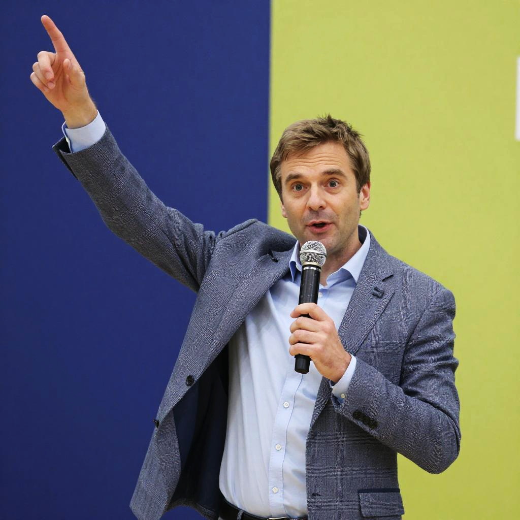 Gediminas Pranckevicius giving a presentation, dynamic pose, corporate setting, vibrant colors, detailed facial expression, high resolution