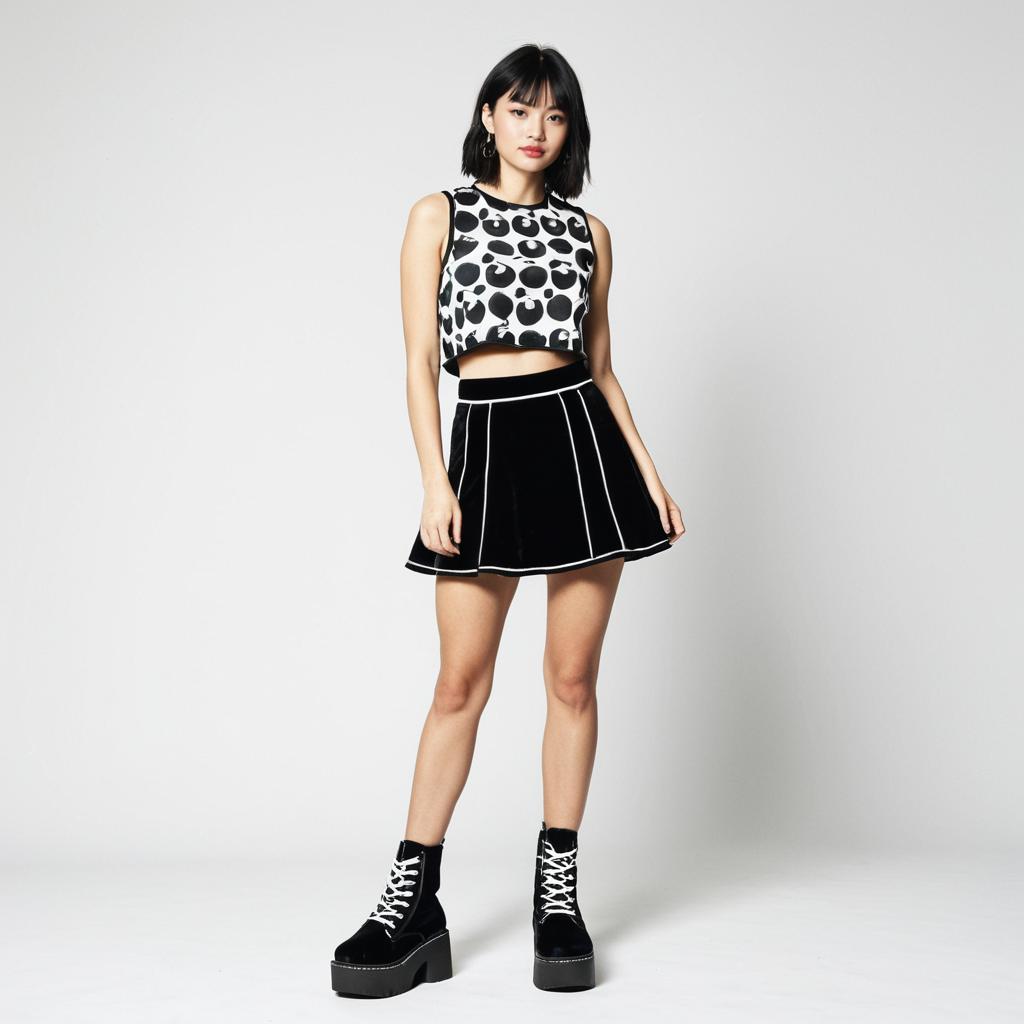 Woman, pop art fashion, cropped tank top with bold graphic print, round neckline, sleeveless, high-waisted black velvet mini skirt with white piping, flared silhouette, platform ankle boots in black, white background.