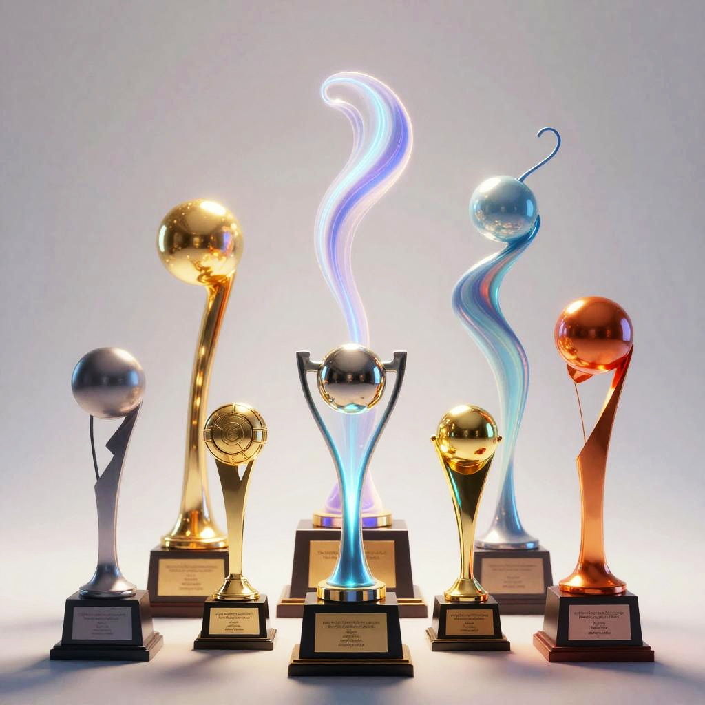 Photograph of six abstract, sculptural trophies with varying shapes and colors, displayed against a white background. The trophies feature glass-like surfaces, each with a unique design: a silver sphere on a metallic stem, a gold globe on a curved arm, a blue wavy form with a small globe, a red-orange sphere on a curved stem, a smaller silver sphere on a black base, and a gold sphere on a black base. Each trophy has a small, rectangular plaque at its base. The lighting highlights the reflective surfaces, creating a glowing effect.