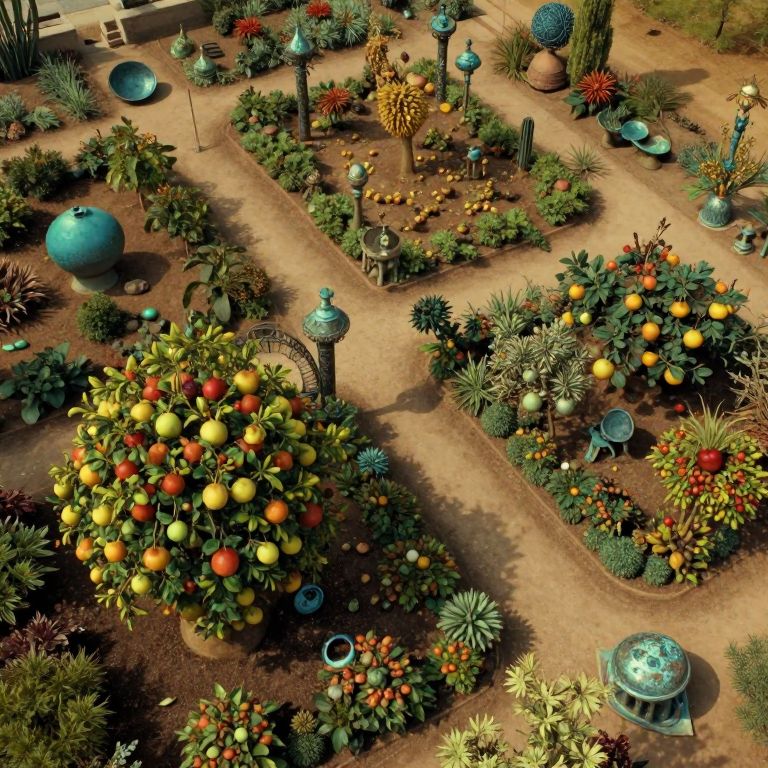 Create an aerial view of a surreal landscape where time appears to fold into reality, reminiscent of Dali-esque dreamscapes. In this scene, a garden grows in both forward and backward directions, its flora bearing fruit that are simultaneously ripe and overripe, creating a captivating tableau that invites the viewer to explore. The palette should consist of warm, earthy tones contrasted by the cool sheen of ancient artifacts scattered throughout, evoking a sense of wonder and intrigue as the past and future intertwine harmoniously within this enigmatic realm.