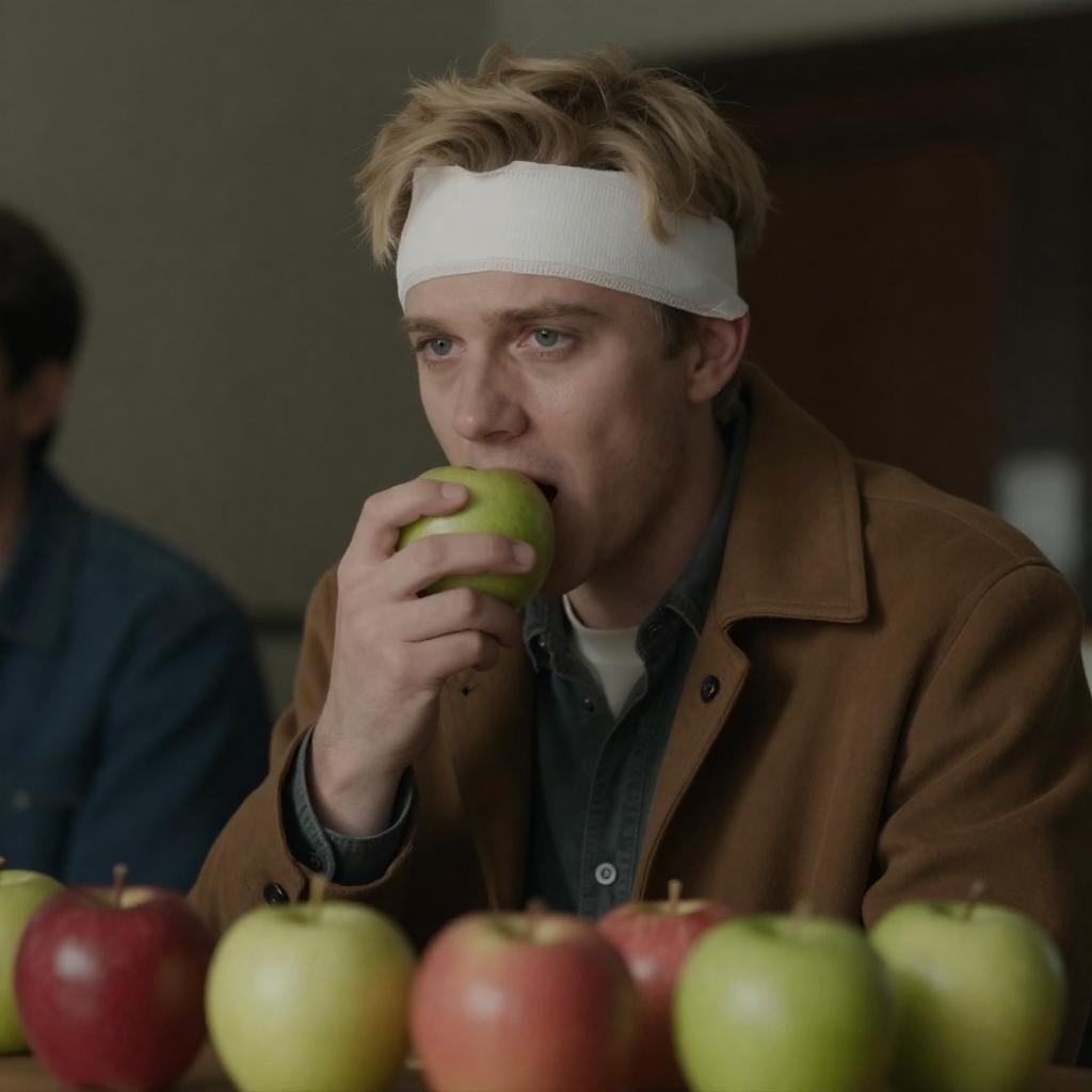 Photograph of a man with light blond hair, white bandage on head, brown coat, eating a green apple, surrounded by red and green apples on a table. Dimly lit background, partially visible second person on left. Intense gaze.