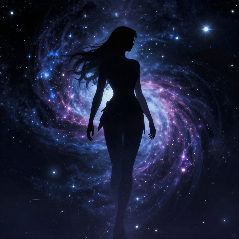 Hovercraft silhoutte of a 20 year old beautiful paladin, she is cosmic, filled with stars, antimatter, epic, album art,