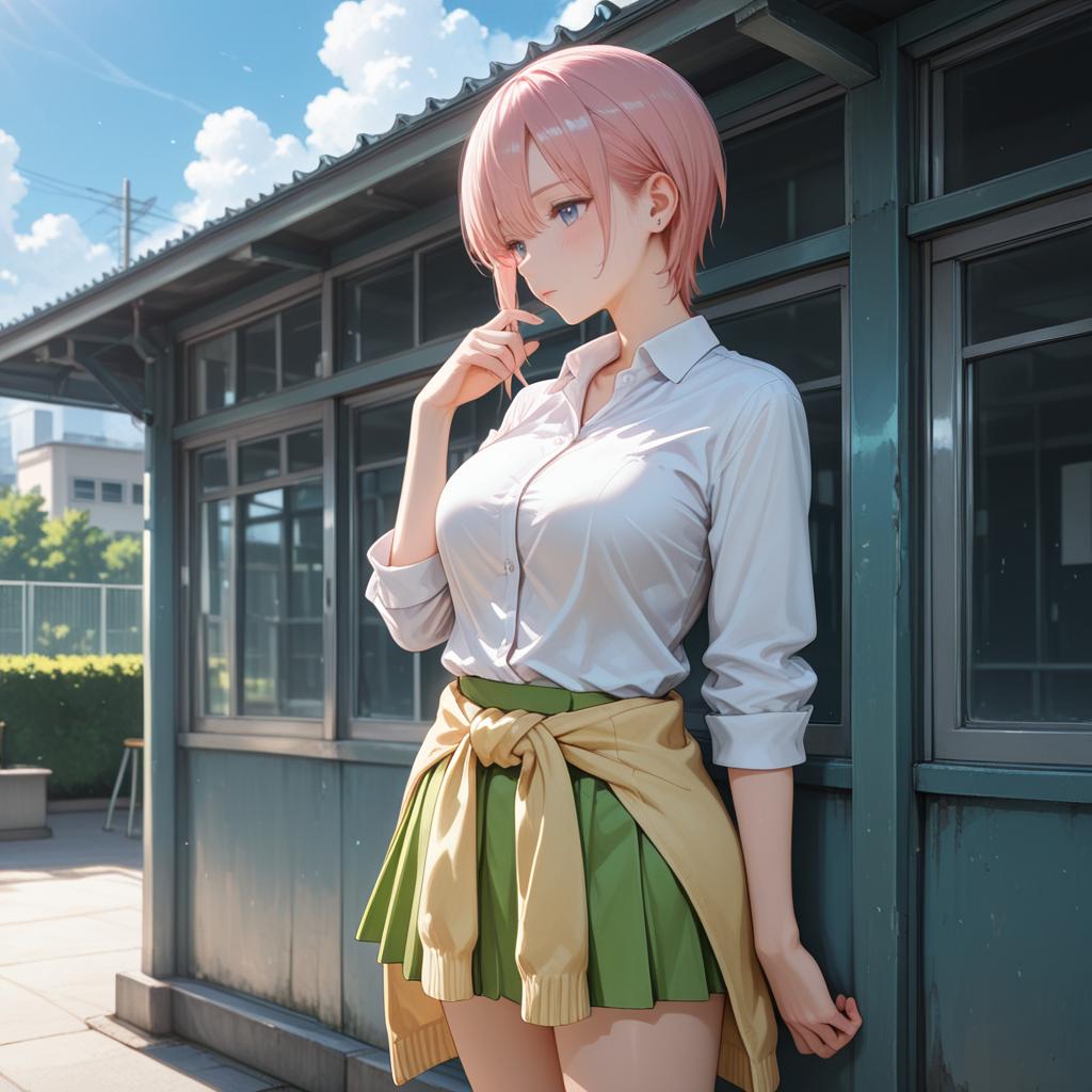 2d, masterpiece, best quality, anime, highly detailed, 1girl, solo, cowboy shot, collared shirt, green skirt, miniskirt, medium breasts, standing, school, outdoors
