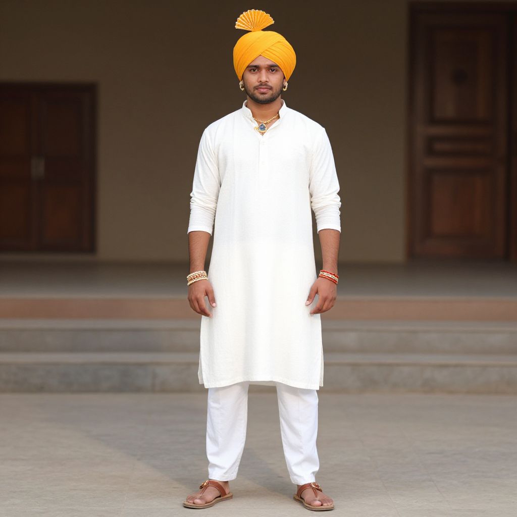 Photograph of a bearded Indian man in a white kurta, white pants, and bright orange turban, standing outdoors with brown sandals, gold