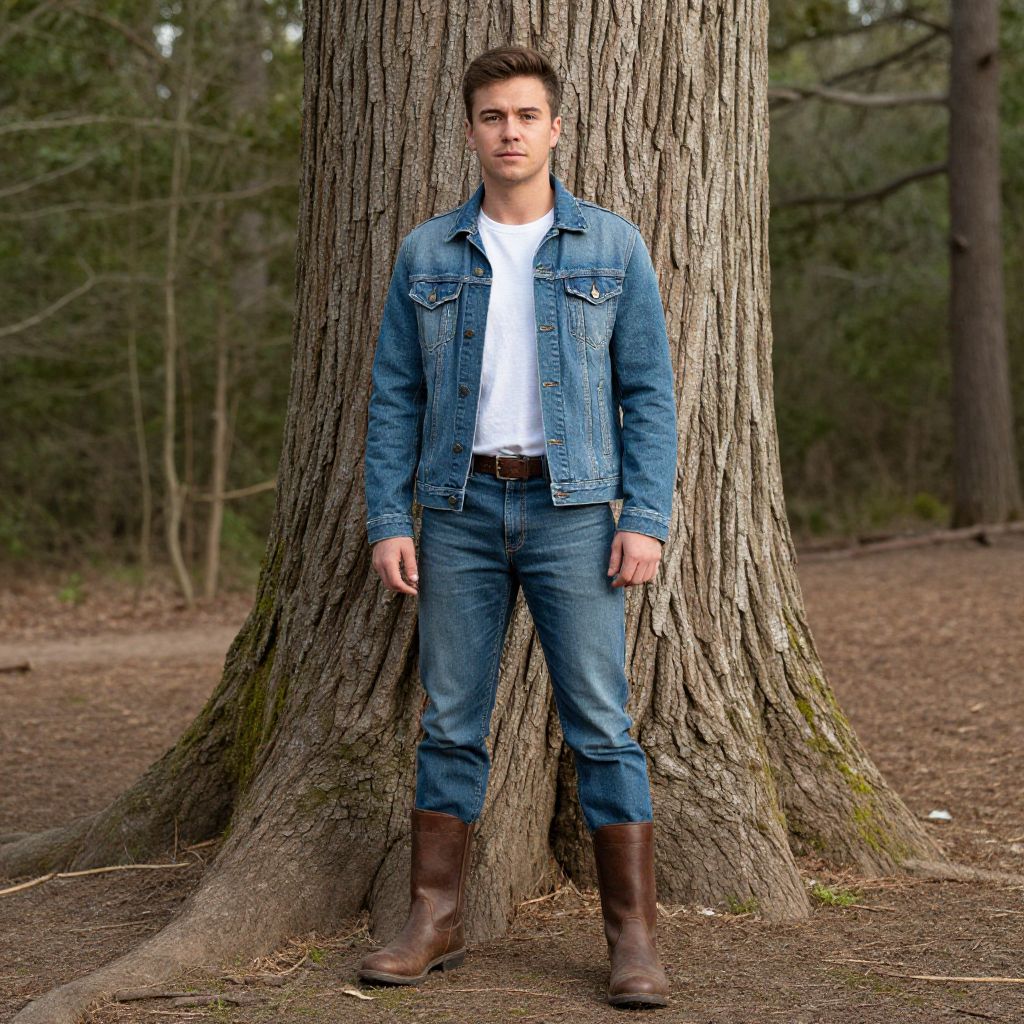 Photograph of a young Caucasian man with short brown hair and fair skin, standing against a large tree trunk in a forest. He wears a blue denim jacket over a white t-shirt, blue jeans, and brown leather boots. His hands rest at his sides, and he gazes directly at the camera with a neutral expression. The background shows a wooded area with tall trees and a dirt path. The image has a natural, outdoor setting with earthy tones and a slightly blurred background to emphasize the subject.