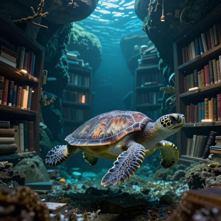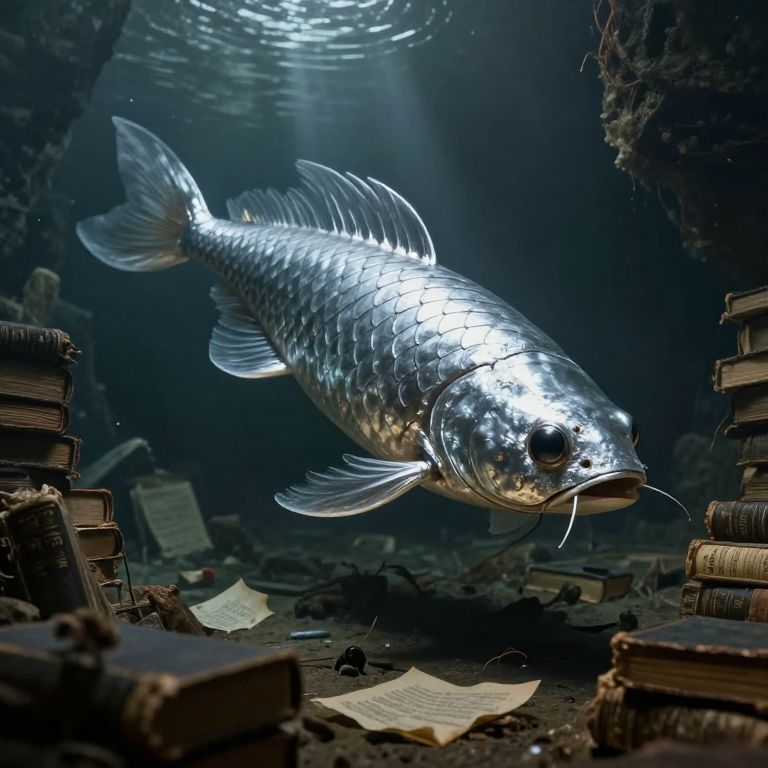 A colossal, ethereal fish with vibrant orange fins and whiskers glides serenely through a sunlit underground cavern, surrounded by scattered books and ancient stone arches, defying the boundaries between aquatic and terrestrial realms.